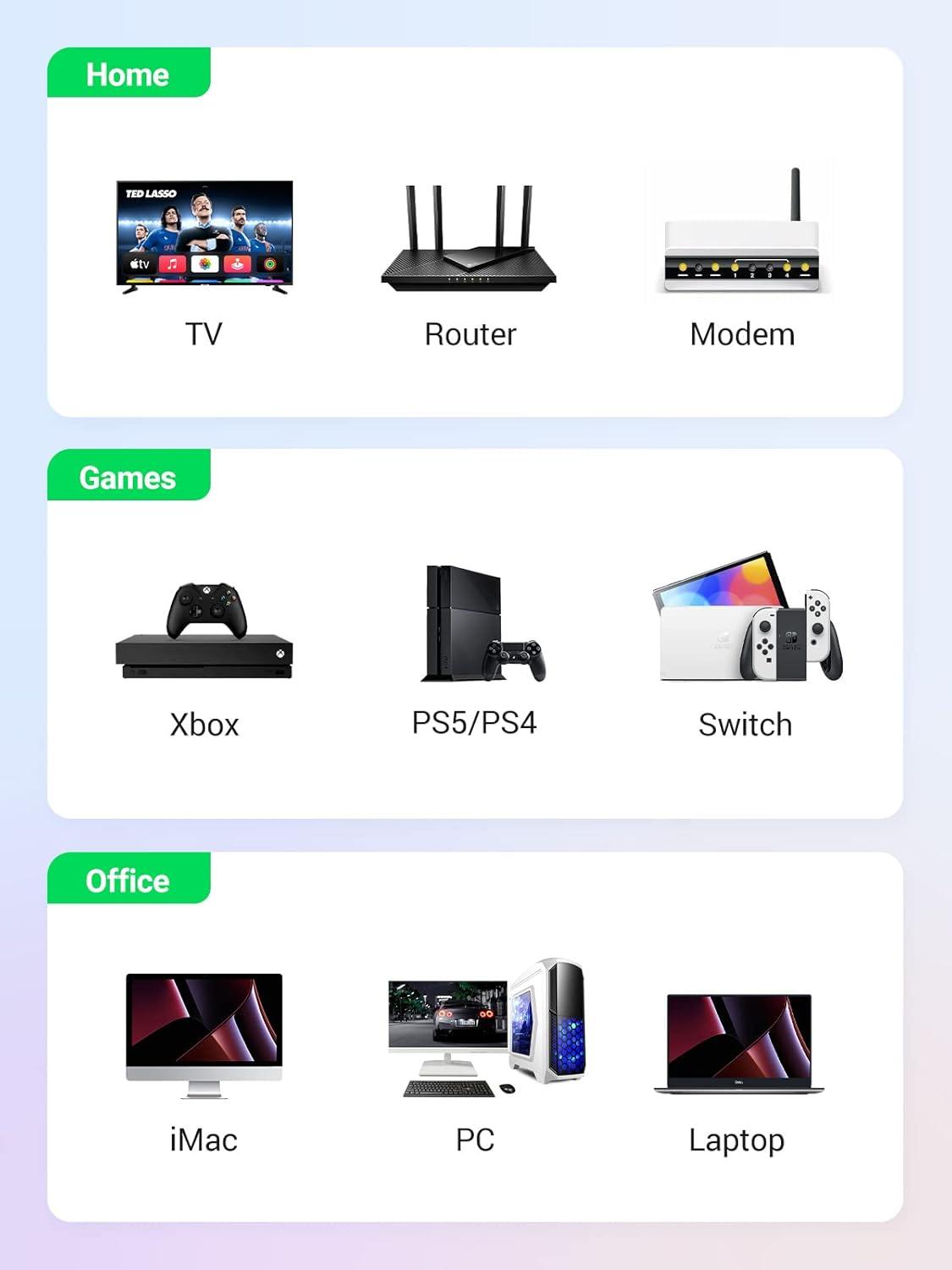 • Widely Compatible: With the RJ45 Connector, UGREEN Cat 7 ethernet cable can be perfectly compatible with computers, laptops, modems, routers, PS5, PS4, PS3, X-Box 360, X-Box One, Switch, networking switches, ADSL, network adapters, hubs, and other networking devices. It can also be fully backward compatible with Cat6e, Cat6, Cat5e, Cat5.